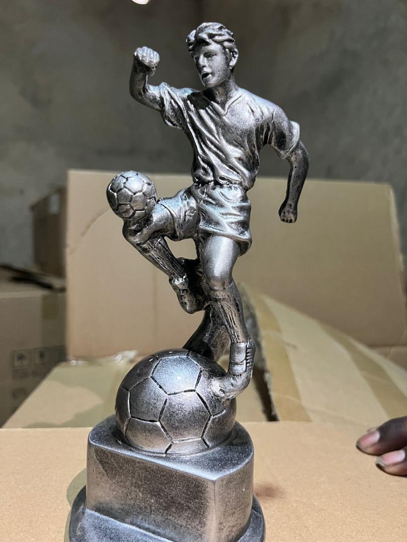 Un trophée de football au design dynamique, capturant la maîtrise technique du joueur. Sa finition argentée patinée offre un contraste prestigieux avec les trophées dorés classiques.