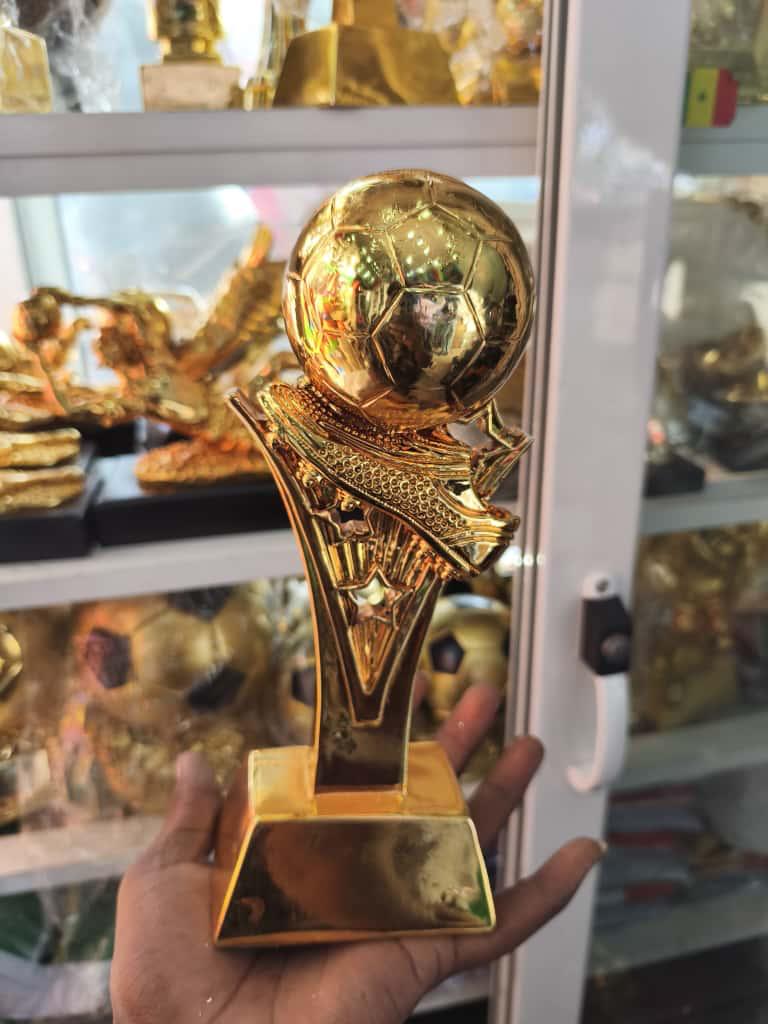 Ce trophée majestueux met en avant un gant de gardien détaillé sur une colonne haute texturée. Sa finition dorée miroir apporte une dimension de luxe à vos remises de prix au Sénégal.